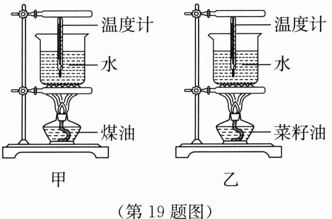 19. (6分) 小明和小辉学习了燃料的热值后,一起设计了一个实验来探究煤油和菜籽油热值的大小关系,他们组装了如图甲、乙所示的装置进行实验,两相同烧杯中水的质量相同,实验记录的结果如表一、表二所示.