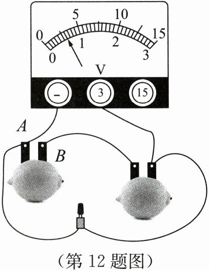 12. 小明将A、B两种不同的金属片分别插入柠檬,制成两个相同的"柠檬电池",连接了如图所示的电路,发光二极管发光,电压表有示数.