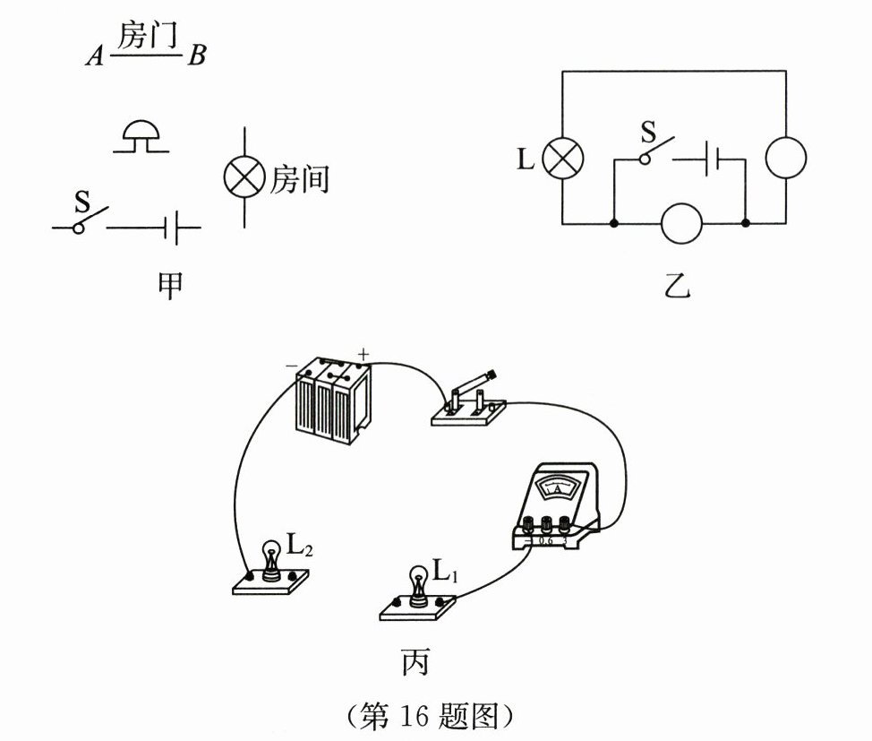 (2) 如图乙所示,在圆圈内填入电压表或电流表的电路元件符号,使开关S闭合时灯L能发光,且电表都有示数.