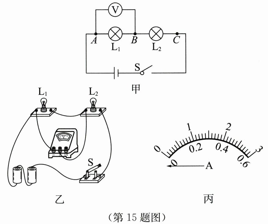 15. 小明选用两节新干电池、小灯泡、电压表、开关、导线若干,用如图甲所示的电路来探究串联电路中电压的特点.