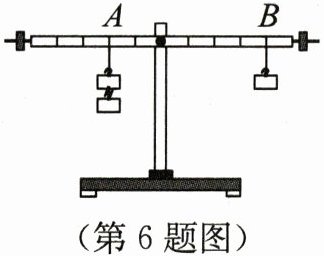 6. 如图所示,每个钩码的质量为50g,在均匀杠杆的A处挂2个钩码,B处挂1个钩码,杠杆恰好水平平衡.在A、B两处再各加1个钩码,那么(