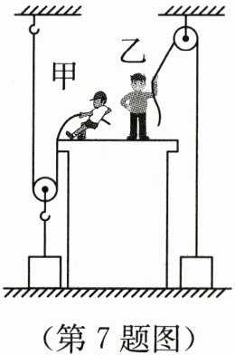 7. 如图所示,甲、乙两人用不同的装置,在相同时间内把质量相等的货物匀速提升到同一平台,不计绳重及滑轮的摩擦.下列说法正确的是(