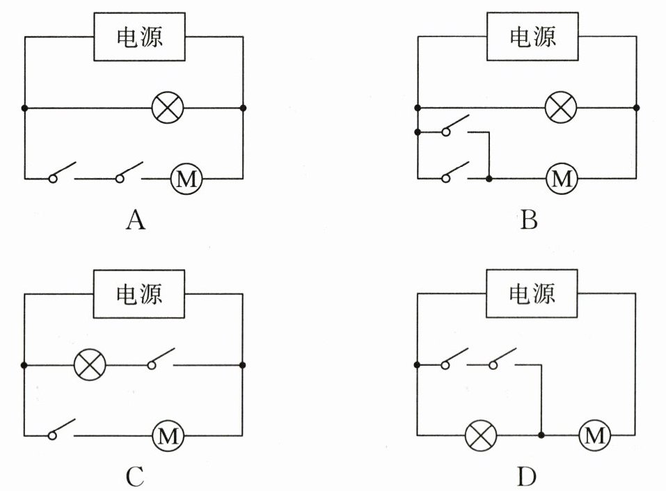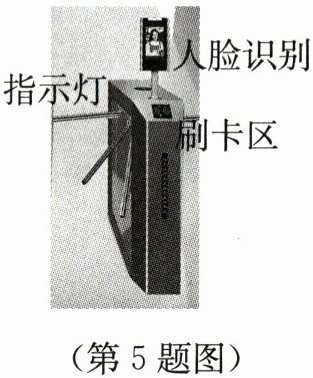 5. 如图所示为封闭小区常见的智能门禁系统,住户可以通过刷卡或人脸识别进入小区.当门禁系统接通电源后,指示灯发光.住户刷卡或人脸识别成功时(相当于分别闭合对应的开关),电动机工作,控制门打开.下列关于门禁系统的简化电路设计合理的是(