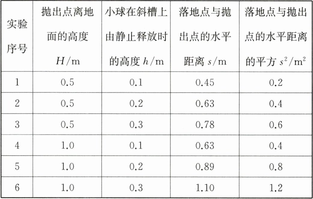 | 实验序号 | 抛出点离地面的高度H/m | 小球在斜槽上由静止释放时的高度h/m | 落地点与抛出点的水平距离s/m | 落地点与抛出点的水平距离的平方$s^{2}/m^{2}$ |