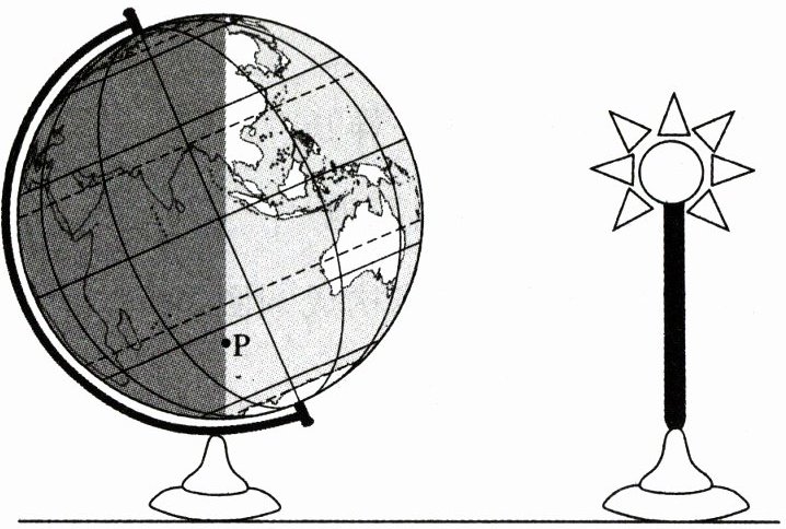 在黑暗的实验室里,老师用电灯作为光源,照射地球仪,自西向东拨动地球仪,演示地球自转运动。读下图,回答 14~15 题。