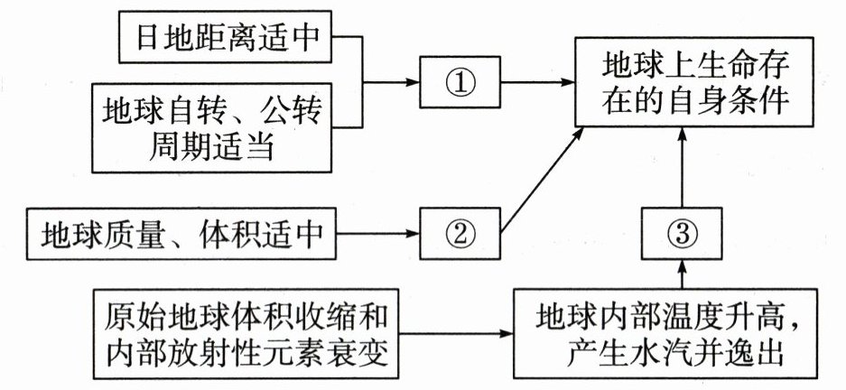 条件。(3) 在太阳系的八大行星中,地球是唯一一颗有生命存在的行星。请在下面思维导图的序号处填写合适选项。
