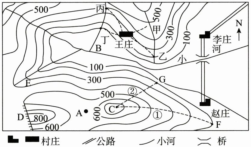 (4) 为了缓解缺水状况,政府拟从山谷的河流中引水到王庄,图示中甲、乙、丙、丁四地为引水源地。综合多种因素,水源地