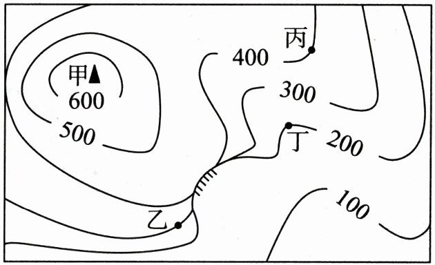 10. 图中甲、乙、丙、丁四地中,位于山谷的是(