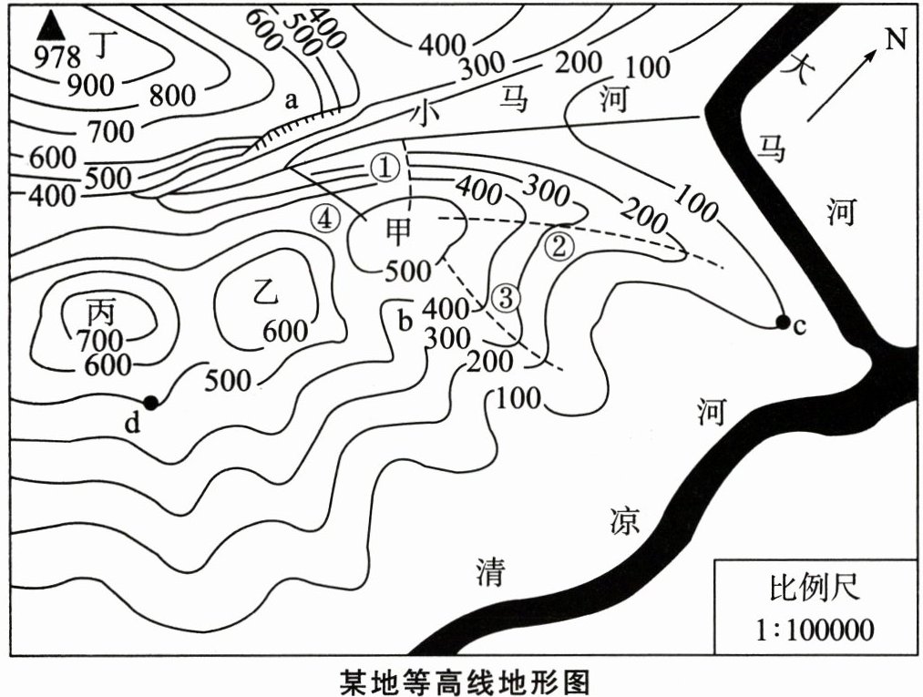 13. 图中甲、乙、丙、丁四座山峰,海拔最高的是(