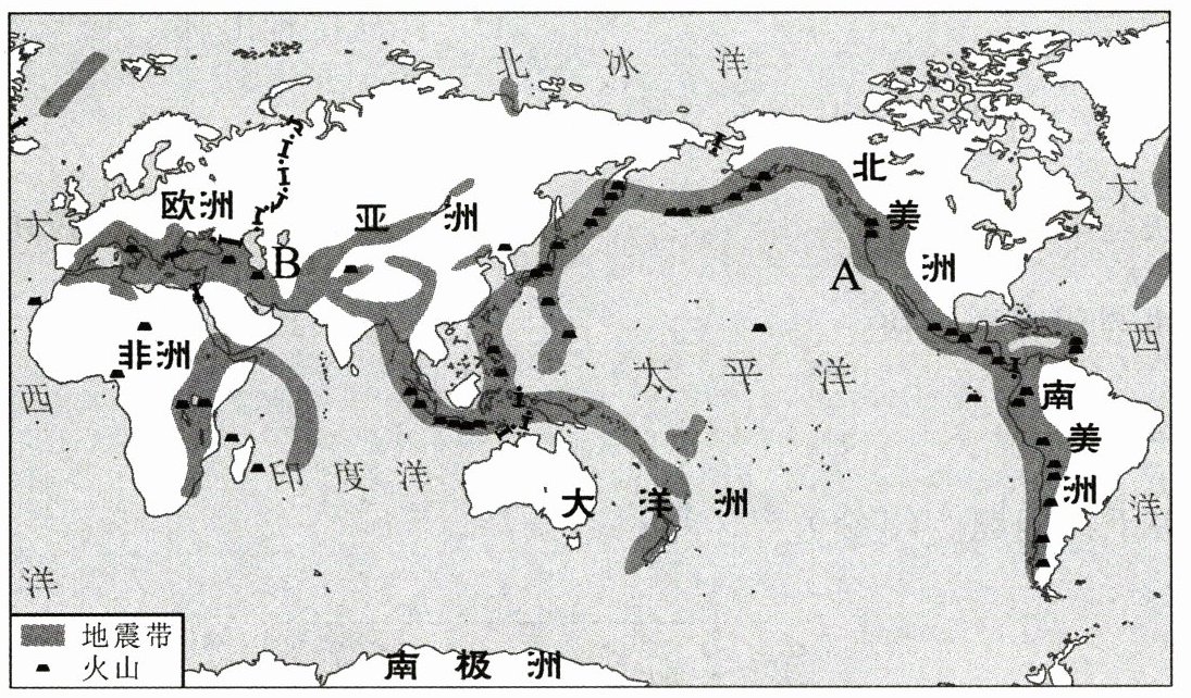 板块交界处。(2) 图中字母 B 位于的火山、地震带是
