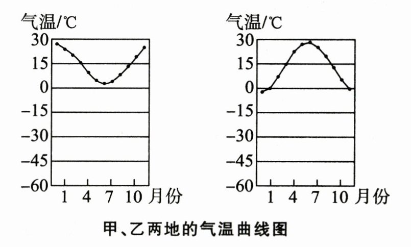 读“甲、乙两地的气温曲线图”,回答7~8题。