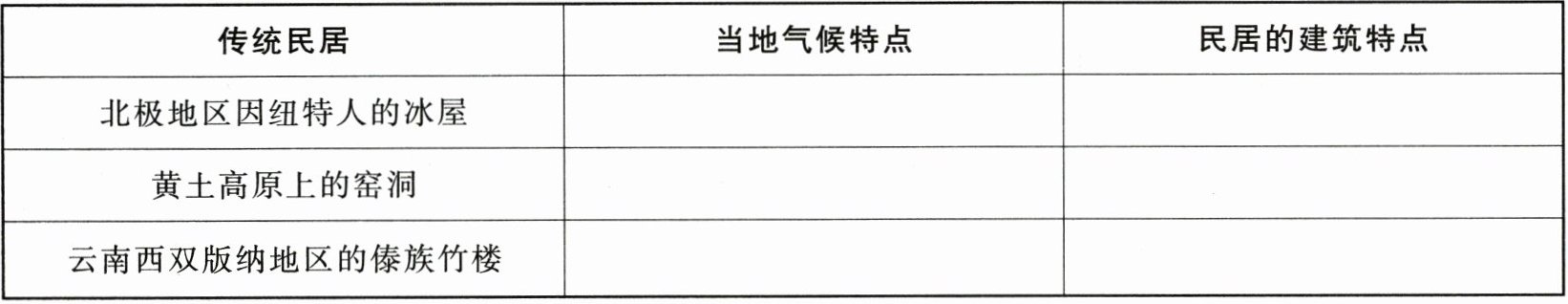 |黄土高原上的窑洞|冬冷夏热,降水较少|利用黄土直立性好的特点,在黄土坡上挖掘而成,冬暖夏凉|