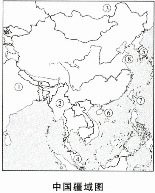 (2) 填出图中数码代号所表示的我国邻国、岛屿、濒临海洋的名称。