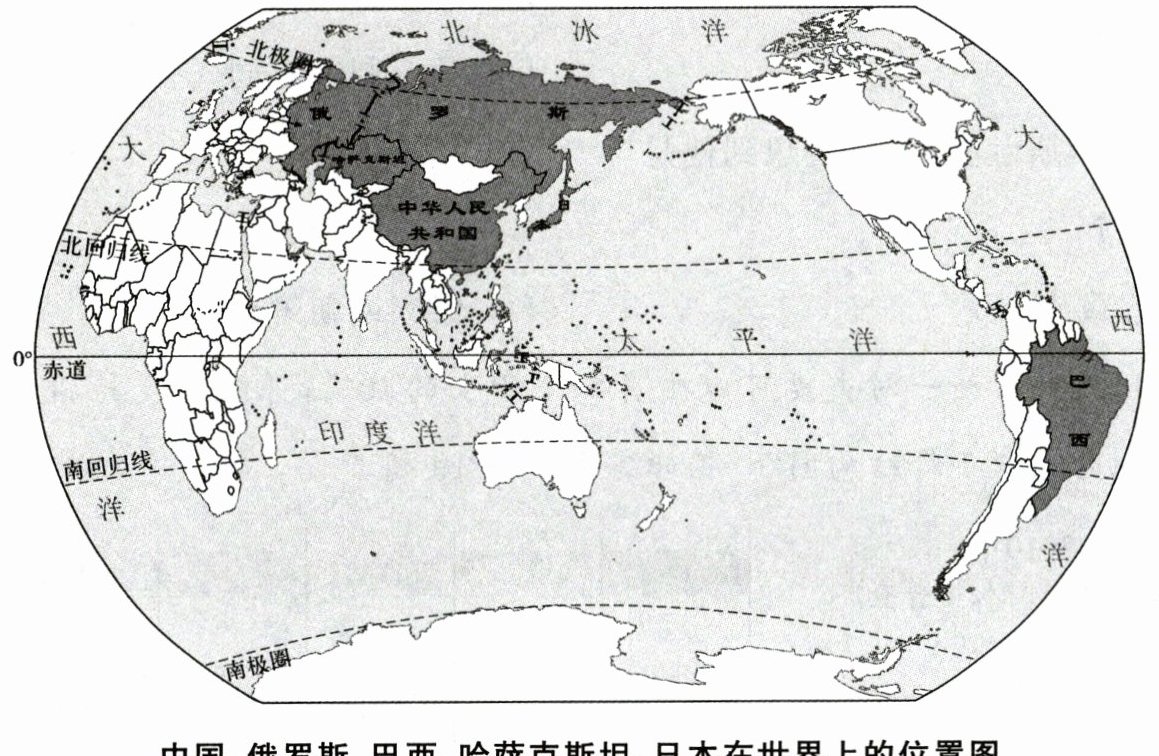 读"中国、俄罗斯、巴西、哈萨克斯坦、日本在世界上的位置图",完成1~3题。