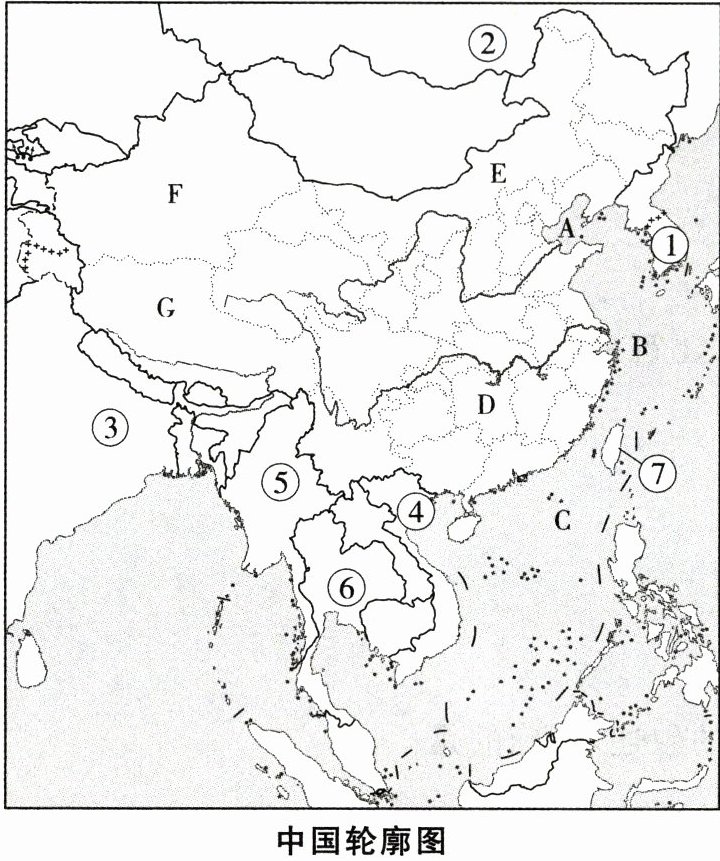 省相望。(3) 我国邻国众多,陆上邻国有②