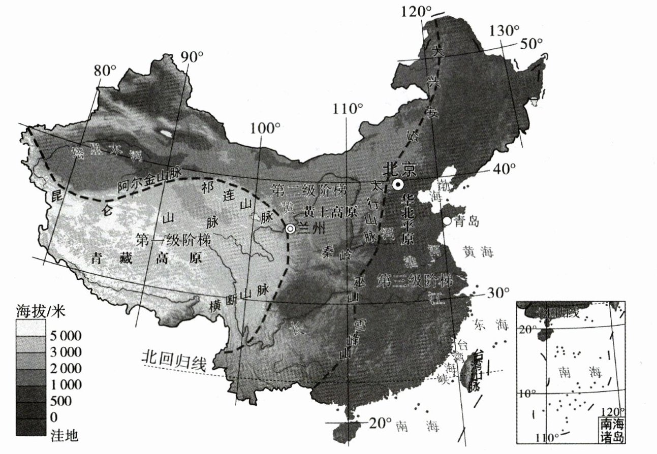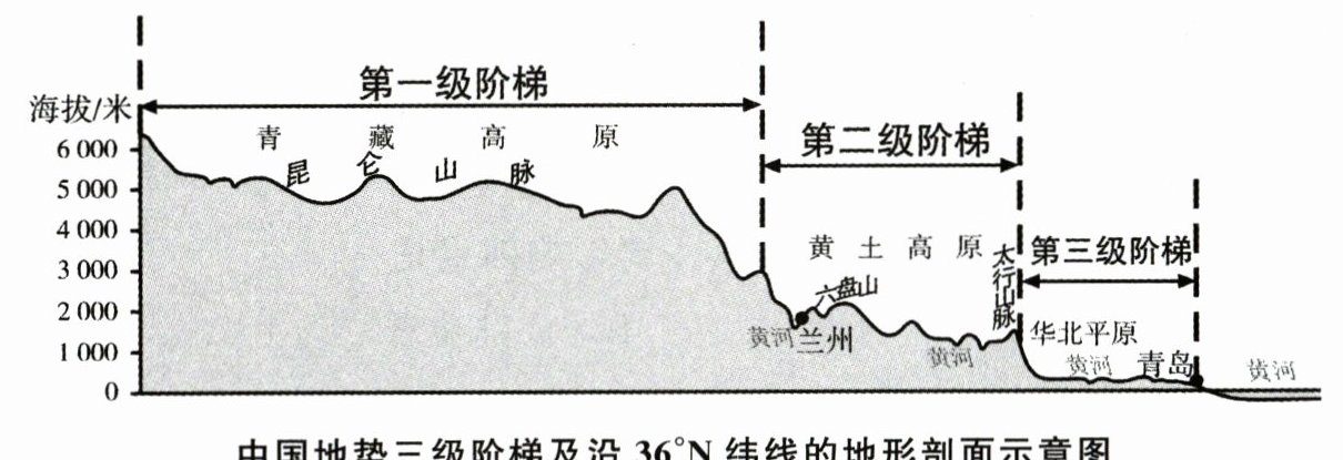 读“中国地势三级阶梯及沿 $36^{\circ}N$ 纬线的地形剖面示意图”,完成 1~6 题。