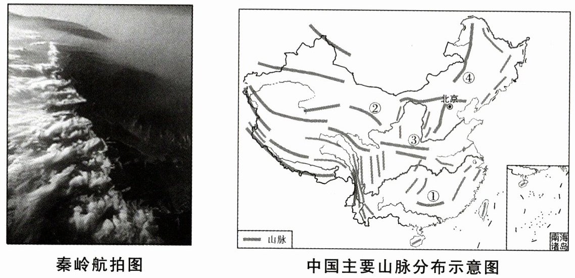 网络上的一张秦岭航拍照(左下图)登上了热搜,山脉两侧云层"泾渭分明"的景象引发了网友的大讨论。中国气象局发长文解释:"当山脉阻挡了暖湿气流,会在一侧出现暖气流抬升形成云,而另一侧气流下沉,出现晴空"。右下图为"我国主要山脉分布示意图"。据此完成15~17题。