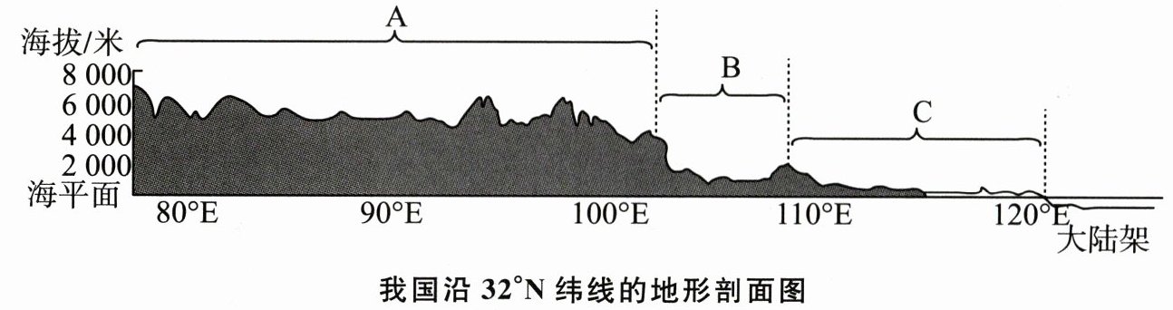 27. 读"我国沿32°N纬线的地形剖面图",回答下列问题。(10分)