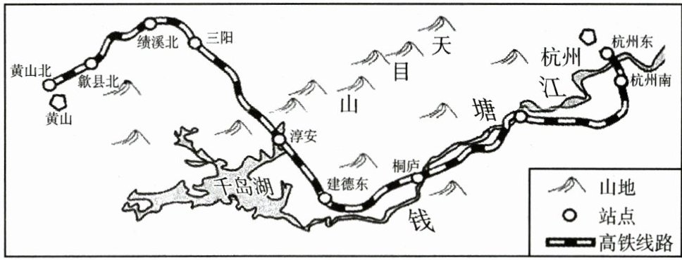 《坐着高铁看中国》感受流动中国之美。杭黄高铁穿越西湖、黄山等7个5A级风景区,桥隧比高达87.6%,被称为最美高铁。读图,完成19~21题
