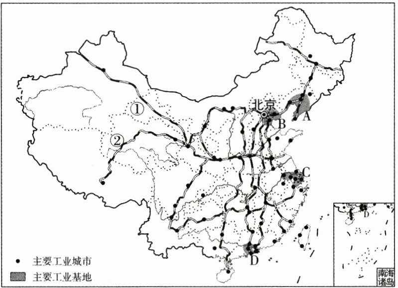 (1) 在图中适当位置填上我国两大工业基地的名称。