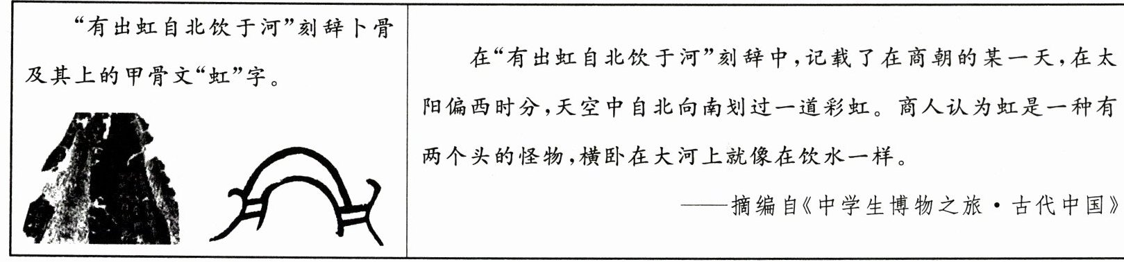 |“有出虹自北饮于河”刻辞卜骨及其上的甲骨文“虹”字。|在“有出虹自北饮于河”刻辞中,记载了在商朝的某一天,在太阳偏西时分,天空中自北向南划过一道彩虹。商人认为虹是一种有两个头的怪物,横卧在大河上就像在饮水一样。|