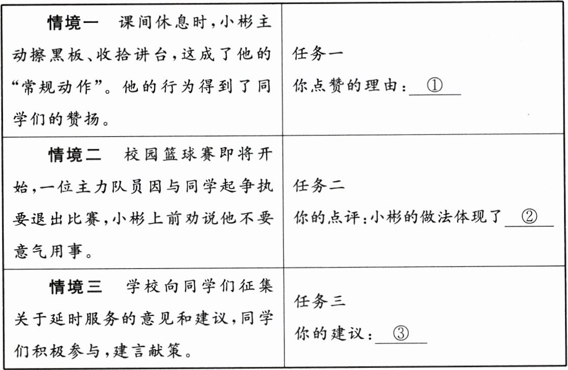 |情境一|课间休息时,小彬主动擦黑板、收拾讲台,这成了他的“常规动作”。他的行为得到了同学们的赞扬。|任务一 你点赞的理由:① |