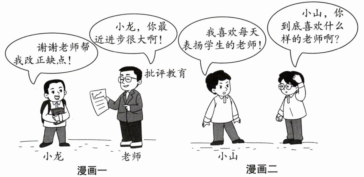 漫画一:小龙对老师说“谢谢老师!我改正缺点!”,老师拿着纸说“小龙,你最近进步很大啊!”(旁边标注“批评教育”)