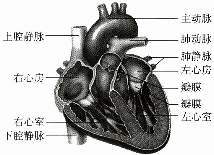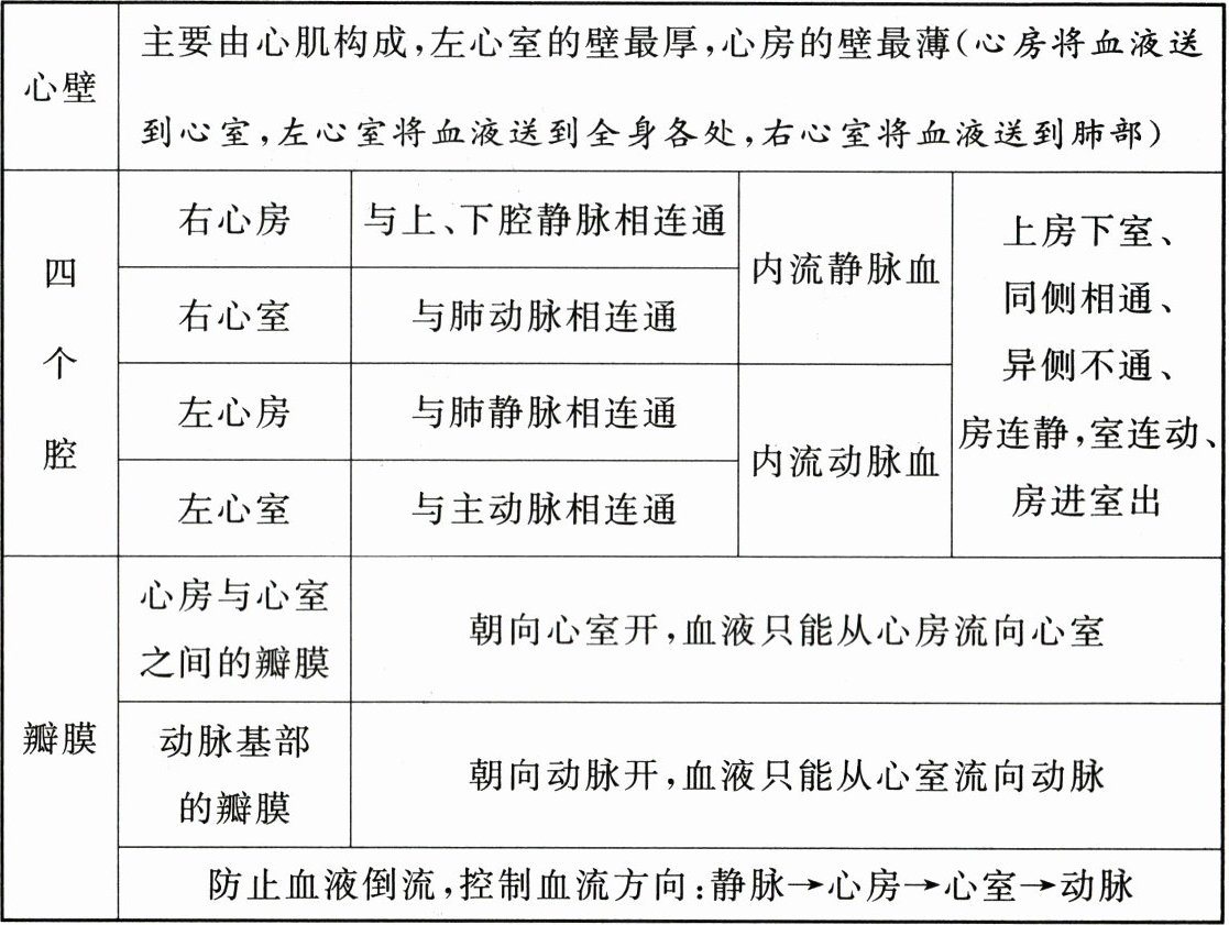 |瓣膜|心房与心室之间的瓣膜|朝向心室开,血液只能从心房流向心室|防止血液倒流,控制血流方向:静脉→心房→心室→动脉|