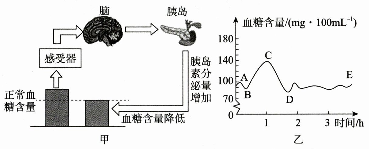 23. 血糖含量相对稳定对人体的生命活动十分重要,正常人体可通过自身调节使血糖含量维持相对稳定。图甲是人体对血糖含量调节的部分过程,图乙是正常人的血糖含量变化曲线。根据图乙可知正常人的血糖含量大约是 (