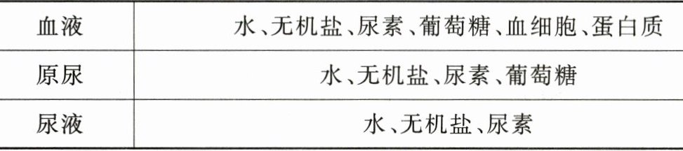 |血液|水、无机盐、尿素、葡萄糖、血细胞、蛋白质|