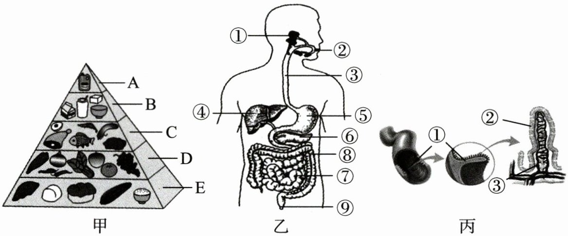 (填序号)。(3)初中生正处于身体发育的黄金时期,建议多吃图甲中B和C层的食物,因为含有丰富的