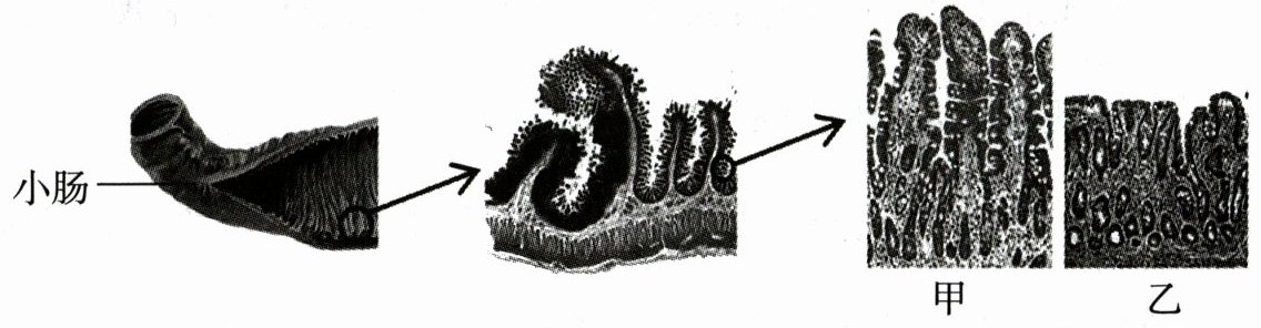 (填器官名称)中被初步消化。(2)谷物中也含有少量蛋白质。小麦中就含有一种麸质蛋白,很难被人体彻底消化,会引发部分人群患麦胶性肠病,出现消瘦、厌食、腹泻等症状。科研人员对健康人和麦胶性肠病患者的小肠内壁组织进行取样并观察,结果如图所示。