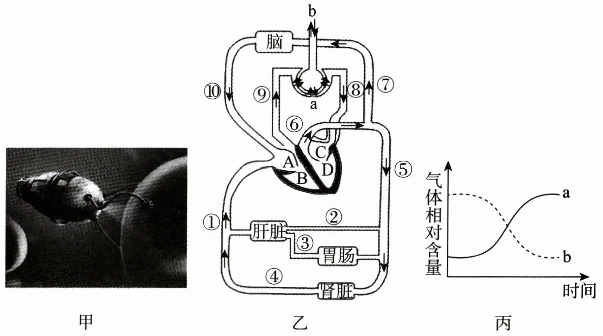 33. (8分)血管机器人(图甲)已逐渐成为医学领域的研究热点,任何与血管有关的疾病都可派血管机器人去参与治疗,它可以在血管中快速稳定地游动和悬浮倒退,用于疾病诊断以及对血管进行微创伤手术。图乙、丙是人体局部血液循环以及气体交换含量变化示意图,据图回答: