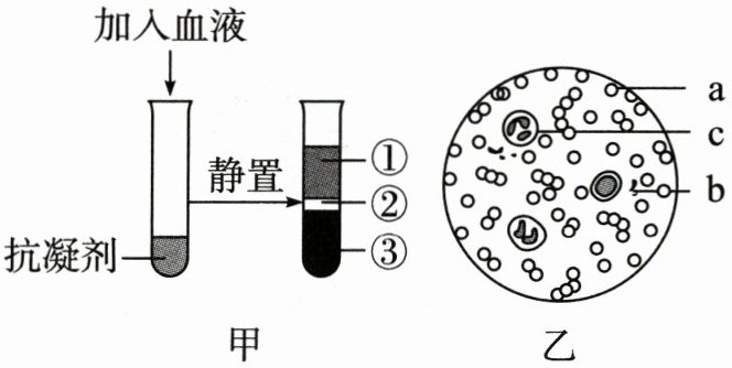 11. 图甲表示人新鲜血液的分层现象,图乙为显微镜视野下人的血细胞涂片示意图,下列分析正确的是(