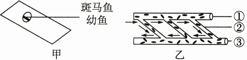 17. 斑马鱼幼鱼早期体小且透明。某小组利用 2 mm 斑马鱼幼鱼制成临时装片(如图甲),用显微镜观察其全身血管和血流情况,并绘制血液流动示意图(如图乙),①②③代表血管,箭头代表血流方向。下列说法正确的是(