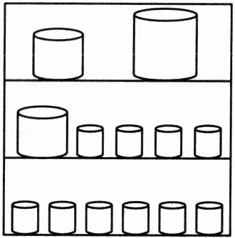 1. 把7.2升果汁倒入三层铁架上放置的大杯、中杯和小杯中(如下图),正好全部倒满且每层所倒果汁的质量相等。每个大杯、中杯和小杯的容量分别是多少毫升?