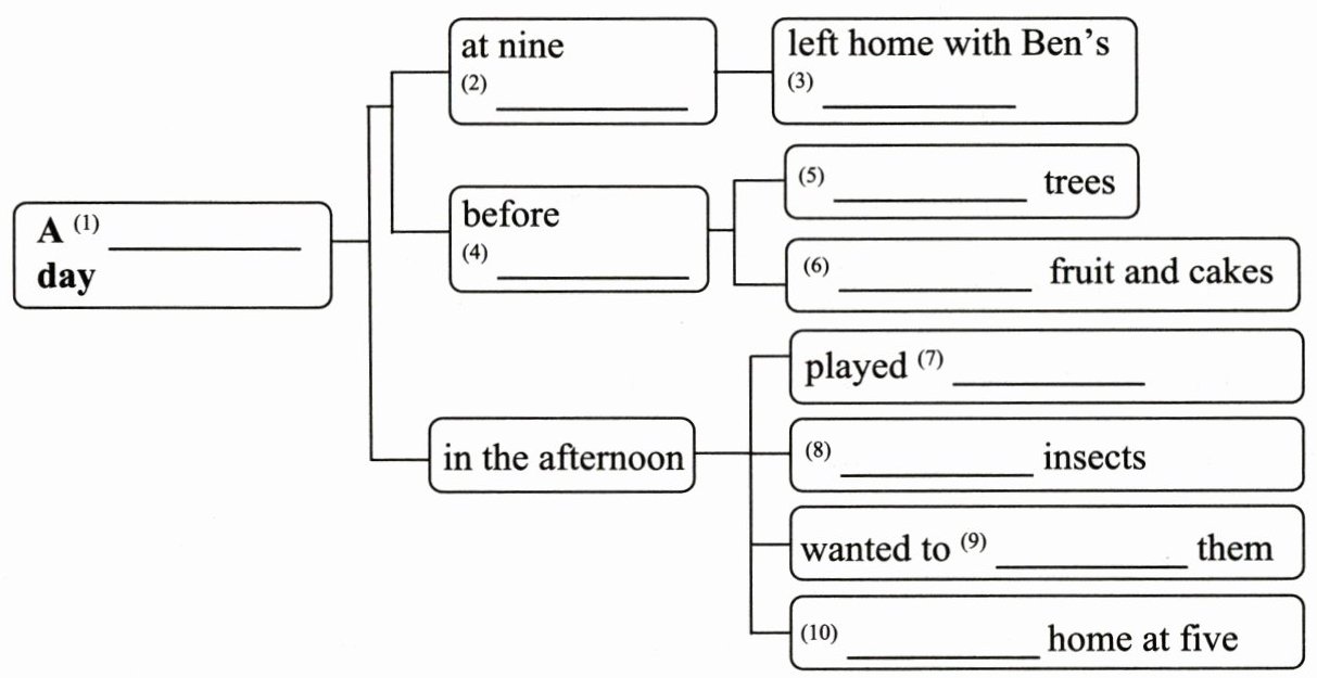 (M)Hello, I’m Ben. I’m from the UK. I had a wonderful day yesterday. I left my home with my cousin at half past nine. We got to the Green Hill at ten o’clock. We planted trees in the morning. Then we had a picnic there. We had some fruit and chocolate cakes. After lunch, we played football together. Then we saw some insects on the grass, and we wanted to catch them. But they flew away. At five o’clock, we went home. We were tired but very happy.