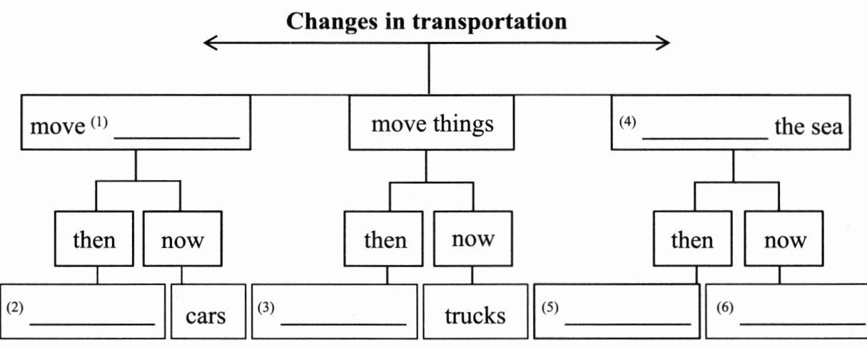 Transportation means moving people or things from place to place. There are great changes in transportation. Long long ago, people used horses to move from place to place. Now most people use cars. Then many people used animals to move things. Now many people use trucks to move things. Then many people crossed the sea by ship. It took many weeks or months. Now people cross the sea by plane. It only takes a few hours. Transportation has changed a lot. The world becomes smaller and smaller.