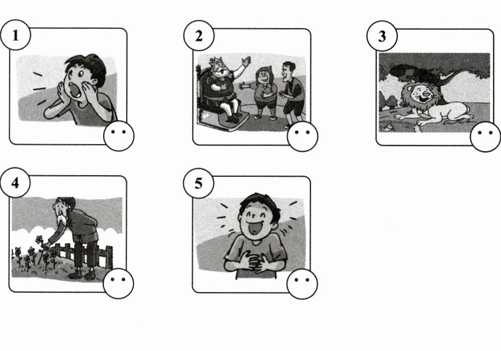 1. The boy looked at the king and laughed. 2. One day, two men visited the king and showed him the new clothes. 3. There is a lion under the tree. 4. A little girl picked a flower in the garden. 5. The little boy pointed at the man and shouted.