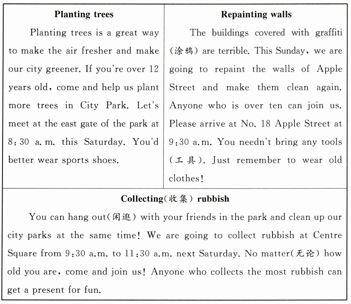 )2. According to the passage,you can't volunteer to ________ if you are eleven.A. plant trees B. repaint walls C. collect rubbish