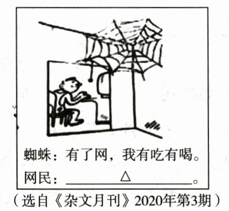 6. (2023·江苏苏州中考)漫画家陈景凯立足生活,以“网”勾连蜘蛛和网民,精心设计两者对话,委婉批评了网络成瘾现象,体现了漫画幽默与讽刺的特点。请仔细观察漫画,将对话补充完整,不超过12个字。