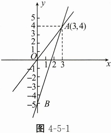 例 3 如图 4 - 5 - 1,一个正比例函数的图象与一个一次函数的图象相交于点 A(3,4),且一次函数的图象与 y 轴相交于点 B(0, - 5)。求: