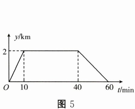 15. 星期天,小明上午 $ 8:00 $ 从家里出发骑车到图书馆借书,再骑车回到家. 他离家的距离 $ y km $ 与时间 $ t \min $ 的关系如图 5. 上午 $ 8:45 $ 小明离家的距离是