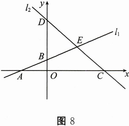 19. 如图 8,直线 $ l _ { 1 } $ 与 $ x $ 轴,$ y $ 轴分别交于点 $ A $,点 $ B ( 0,1 ) $;直线 $ l _ { 2 } : y = - x + 4 $ 与 $ x $ 轴,$ y $ 轴分别交于点 $ C $,点 $ D $;直线 $ l _ { 1 } $ 与 $ l _ { 2 } $ 交于点 $ E ( 2,m ) $.