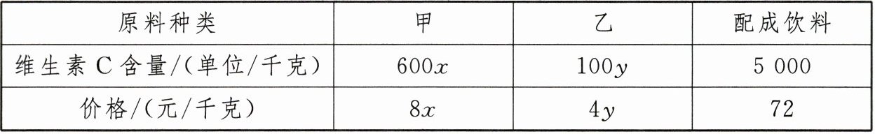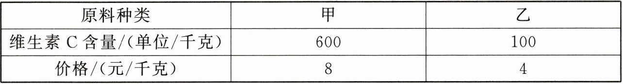 用甲、乙两种原料配制某种饮料,已知这两种原料的维生素 C 含量及价格见下表: