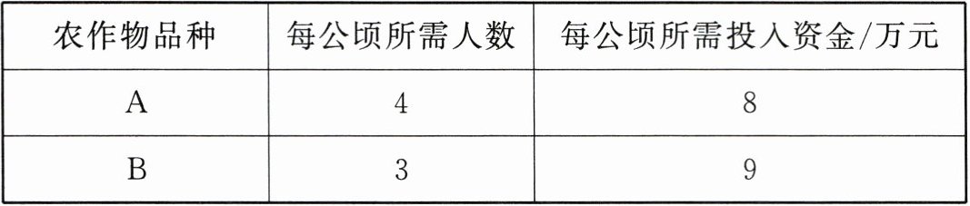 5. (2024·安徽中考)某村有部分青年承包了一些田地,采用新技术种植 A,B 两种农作物. 种植这两种农作物每公顷所需人数和投入资金见下表: