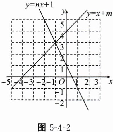变式训练2 如图5-4-2,在平面直角坐标系中,一次函数 $y = x + m$ 与 $y = nx + 1$ 的图象分别与 $y$ 轴交于点 $(0,4)$,$(0,1)$,则关于 $x$,$y$ 的二元一次方程组 $\begin{cases}y = x + m - 3,\\y = nx + 1\end{cases} $ 的解为(