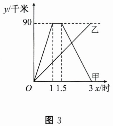 19. 甲、乙两人同时从相距90千米的A地前往B地,甲乘汽车,乙骑摩托车,甲到达B地停留半个小时后返回A地. 图3是他们离A地的距离$y$(单位:千米)与$x$(单位:时)之间的函数关系图象.]
