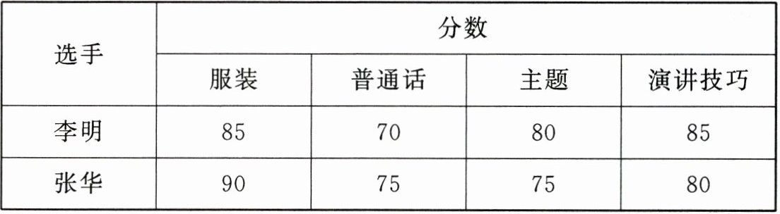 因为$80.5>78.5$,即$\overline{x}_{李}>\overline{x}_{张}$,所以选择李明参加主题演讲比赛,理由是李明的综合得分更高。
