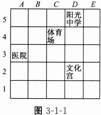 > 例1 图3-1-1是某市区的部分简图,文化宫在D2区,体育场在C4区,据此说明医院在